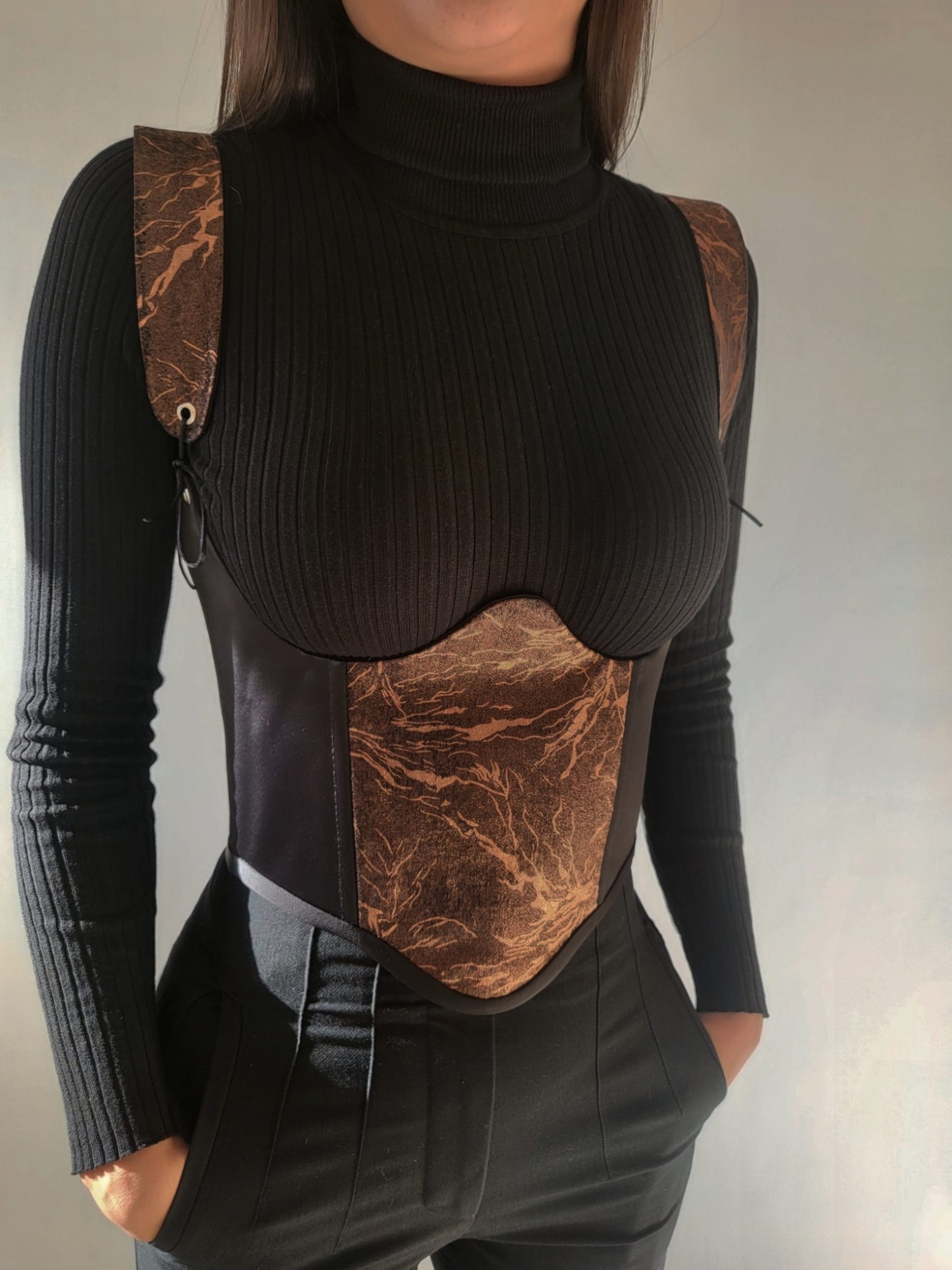 Ce corset au design audacieux est une pièce incontournable pour toutes celles qui recherchent une combinaison parfaite entre élégance, originalité et confort. Inspiré par l’art et la nature, ce modèle unique allie un tissu effet marbré brun cuivré et des accents noirs, créant un look sophistiqué qui ne passera jamais inaperçu.